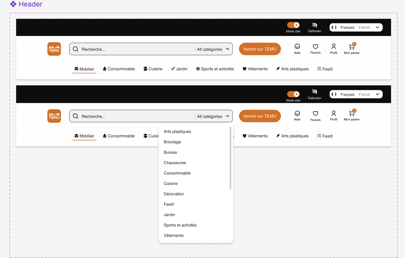 Il repose sur l’utilisation de design tokens et de variables Figma pour la gestion des couleurs, des typographies et des espacements, ainsi que sur un ensemble de composants réutilisables déclinés en variantes.