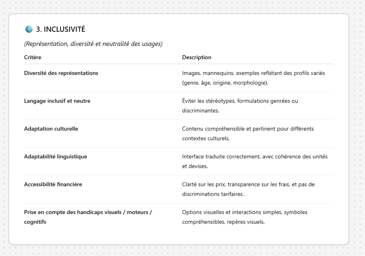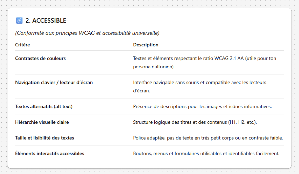Le travail a abouti à une analyse des bonnes et mauvaises pratiques, une étude de l’expérience mobile, ainsi qu’à la définition de quatre axes de refonte : accessibilité, inclusivité, éthique et éco-conception.